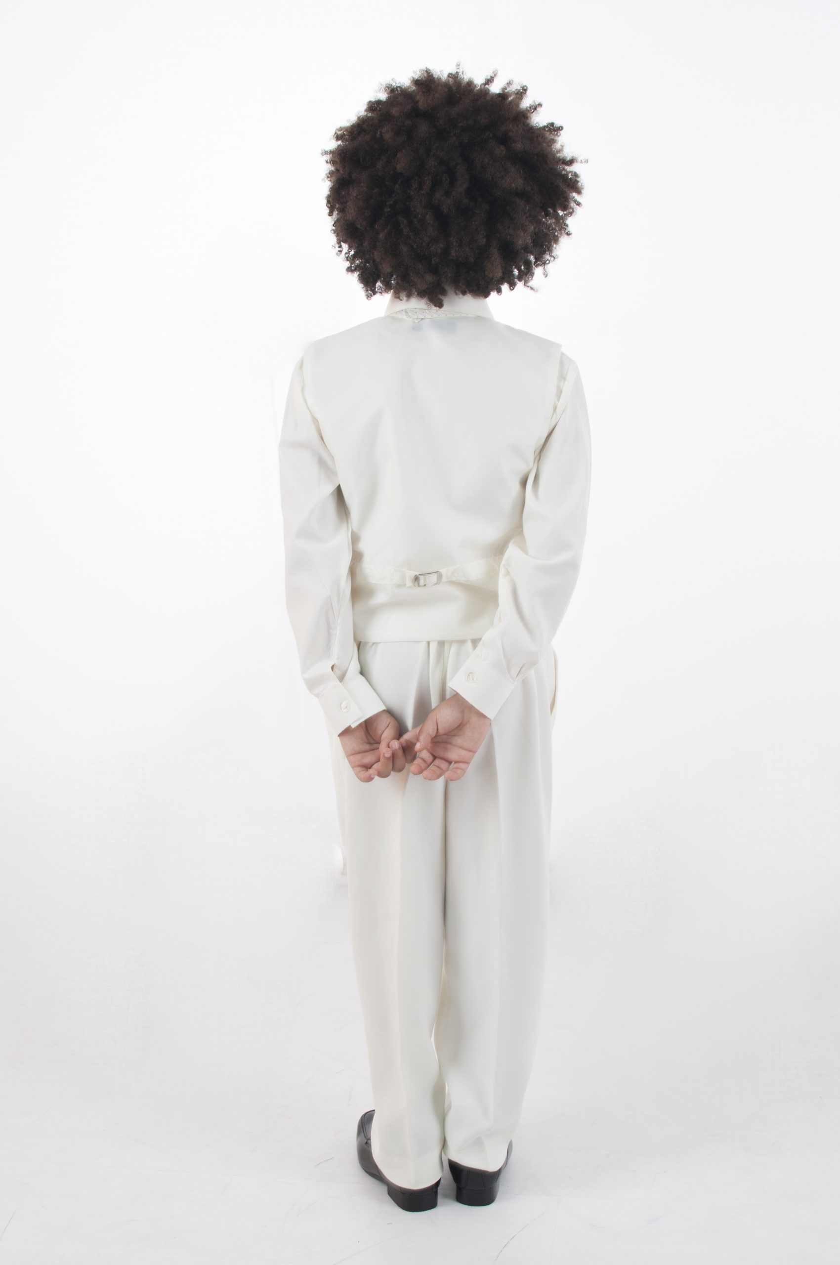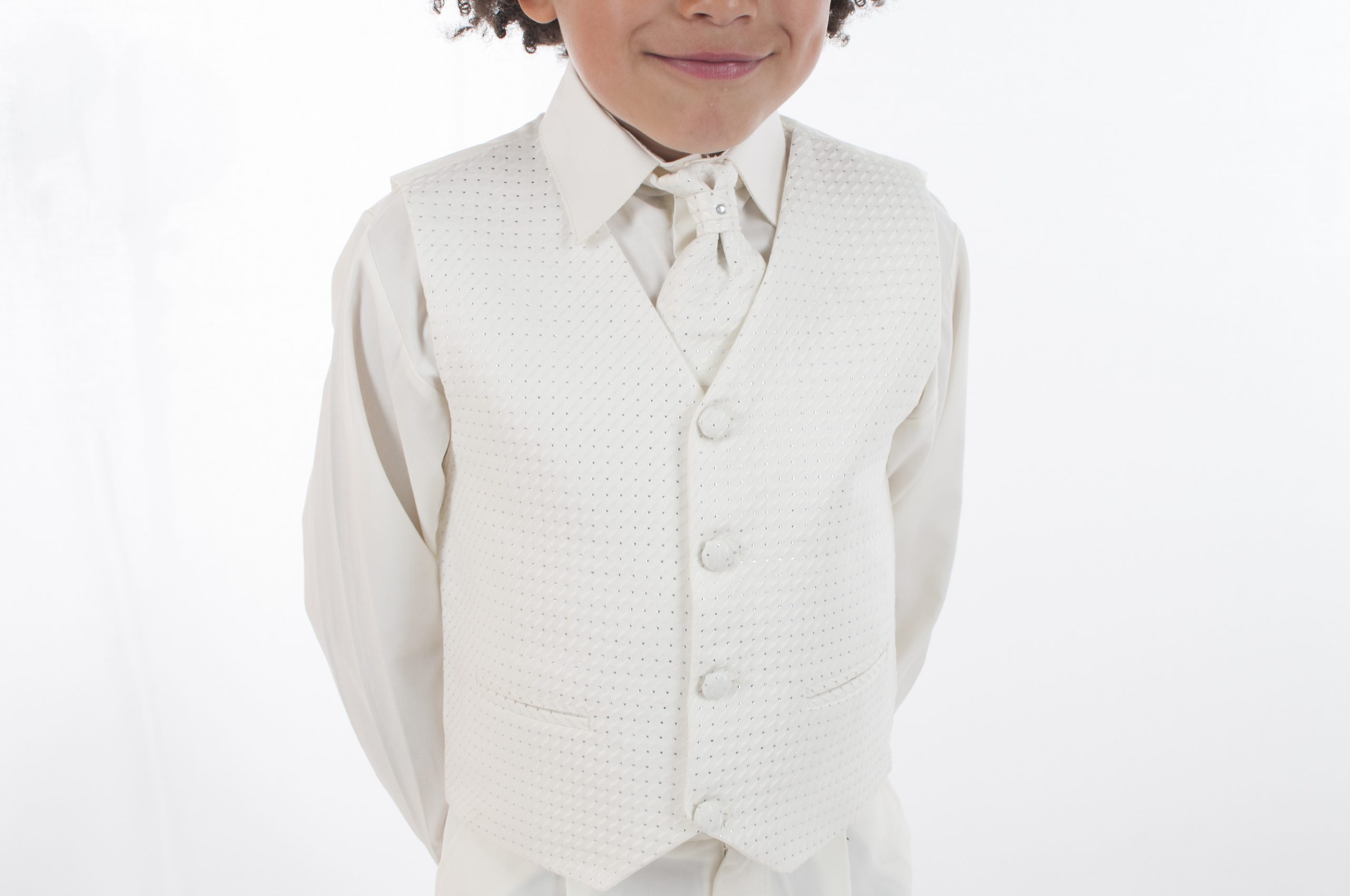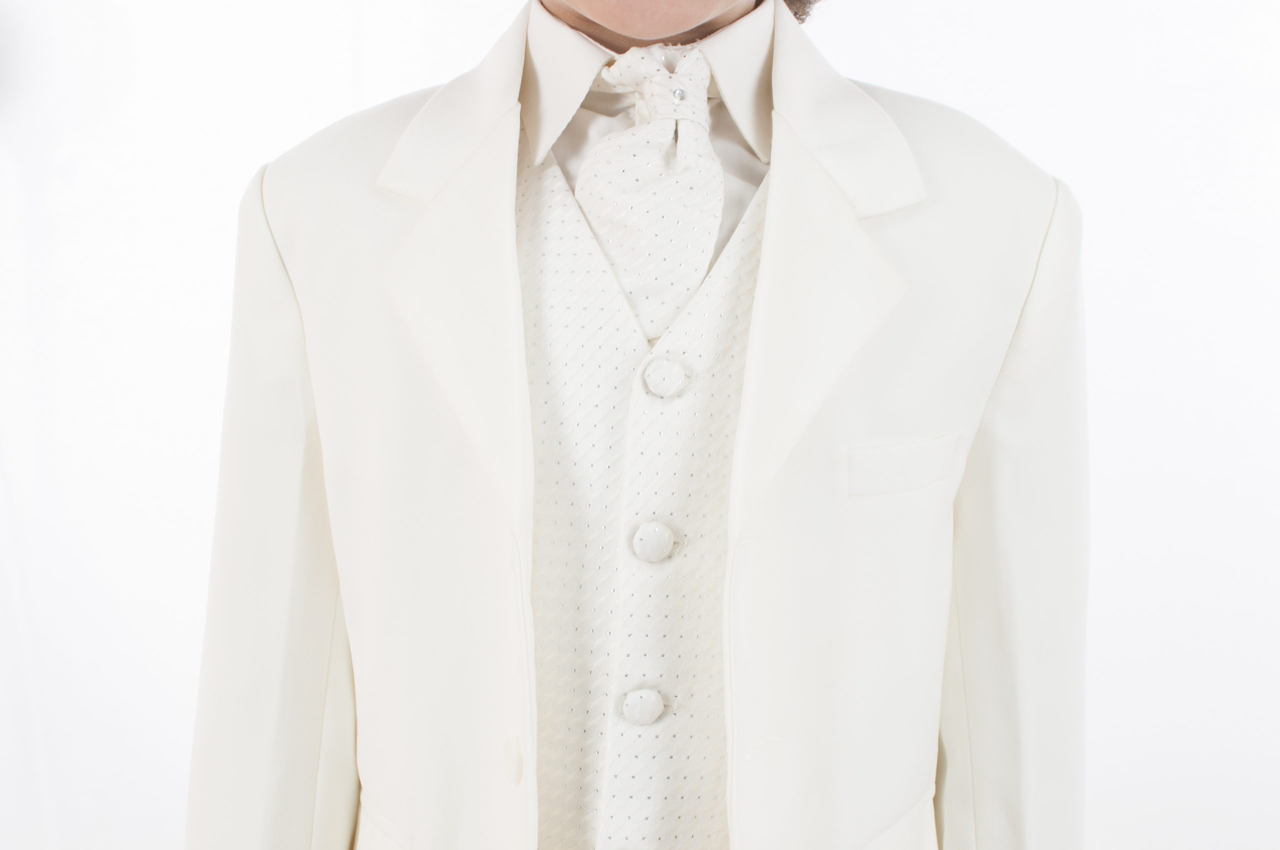 Made from 100% Polyester this suit features elasticated cream trousers and a full sleeve cream shirt and matching jacket. The waistcoat has a diamond stitch pattern with silver stitch detailing, 4 cream buttons at the front and an silver clasp at the back for size alterations. The suit also comes with an elasticated matching cravat encrusted with a small diamante as a finishing touch.