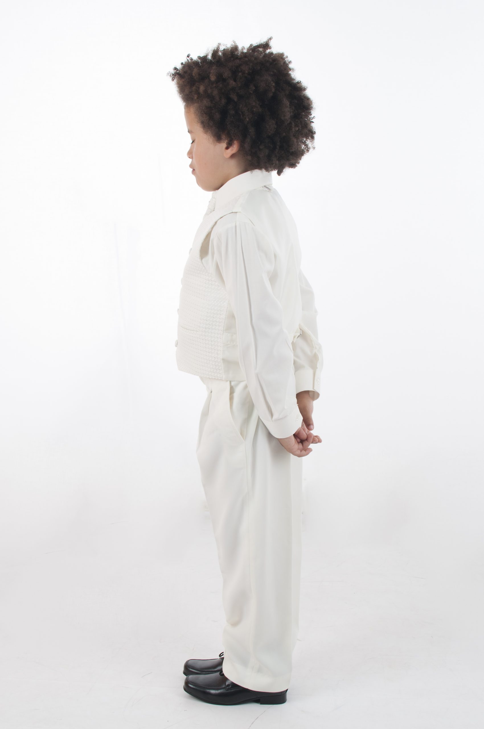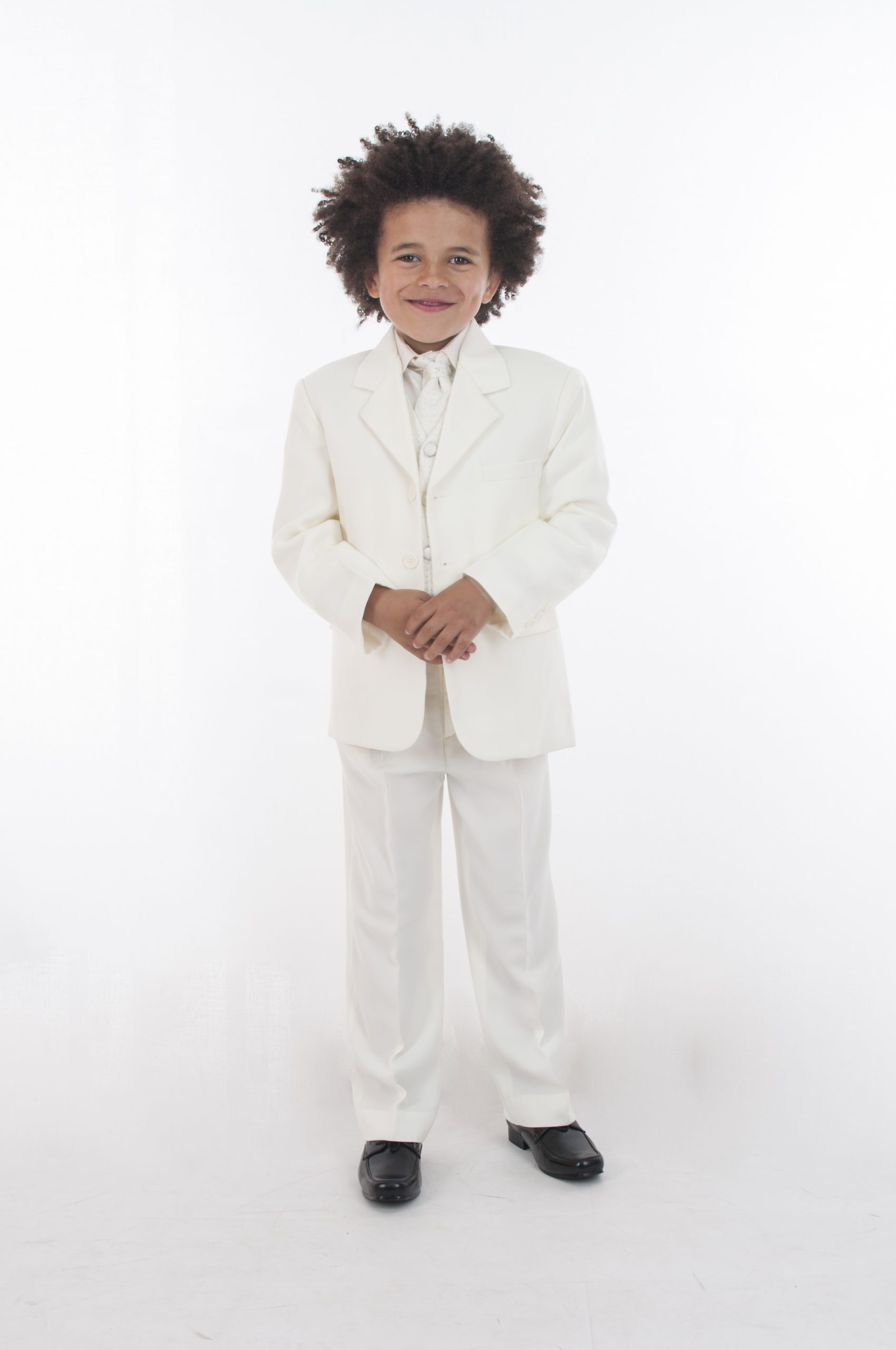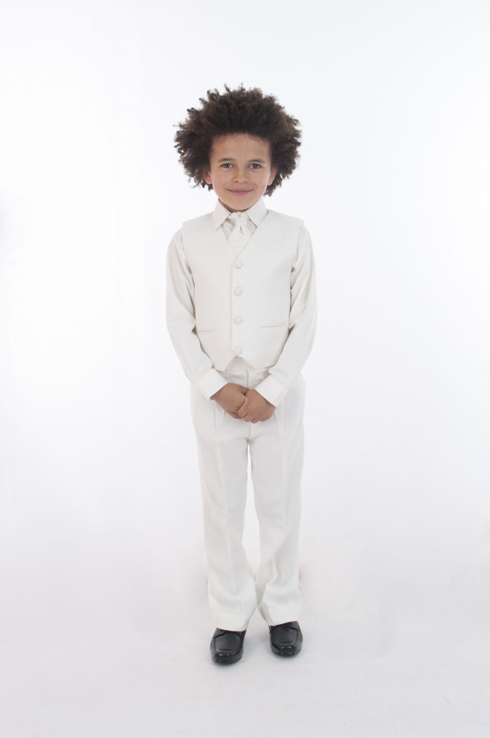 Made from 100% Polyester this suit features elasticated cream trousers and a full sleeve cream shirt and matching jacket. The waistcoat has a diamond stitch pattern with silver stitch detailing, 4 cream buttons at the front and an silver clasp at the back for size alterations. The suit also comes with an elasticated matching cravat encrusted with a small diamante as a finishing touch.