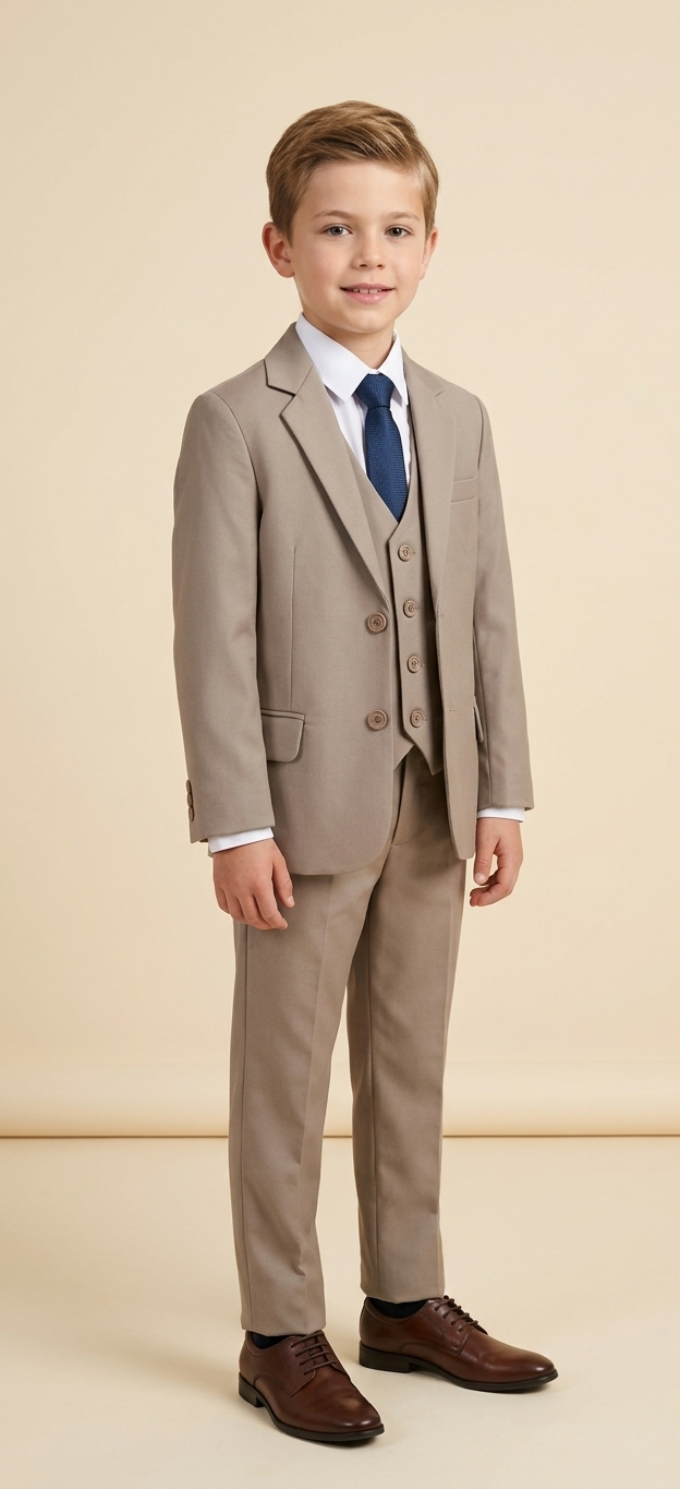 This 5 piece outfit features a 2 button beige suit jacket, elasticated slim fit beige trousers and a white full sleeve collar shirt. The beige waistcoat has a plain design with a silver clasp at the back for size alterations.