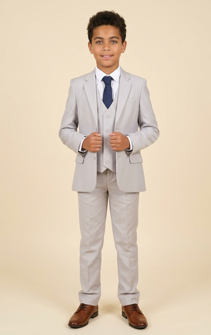 This 5 piece outfit features a 2 button stone suit jacket, elasticated slim fit stone trousers and a white full sleeve collar shirt. The stone waistcoat has a plain design with a silver clasp at the back for size alterations.